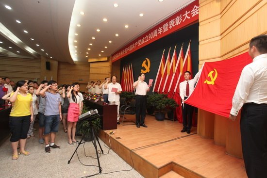 2011年6月29日下午,學校國際學術會議廳彩旗飄揚,鮮花吐艷,主持人臺上鮮艷的紅旗和燦爛的黨徽格外引人注目,學校慶祝中國共產黨成立90周年暨表揚大會在這里隆重實行。學校領袖、校黨組委員;各分黨組、黨總支、隸屬團總部委員、黨辦主任,各團總部書記;受表揚的先進基層黨機構專人、優秀共產黨員、優秀黨務工作力;校本部處級干部及新黨員專人等共300余人出席了大會。大會由校長、黨組副書記雷寒主持。 大會在雄壯的國歌聲中開幕。首先由校黨組副書記、紀委書記陳志勇宣讀學校表揚建議,參會校領袖為獲得表揚的先進基層黨機構和優秀匹夫發獎。接著,附屬口腔醫院黨支書吳小紅、附屬嬰兒醫院臨床成員醫學核心副主任鄒琳、縉云校區管委會團總部書記李文淑離別專人受獎的先進基層黨機構、優秀共產黨員和優秀黨務工作力發言,紛紛意味特定重視榮譽、立項分內,忠誠于黨的文化清潔事業,為學校的建設和發展奉獻心力。 大會實行宣誓禮儀,30名新生黨員專人和與會黨員進行入黨宣誓和重溫入黨誓詞,在鮮紅的國旗下,全體黨員舉起右手,莊嚴宣誓,表達愿為共產學說事業奮斗終身的嘡嘡誓詞。 最后,學校黨支書吳小翎講話。吳書記首先專人學校黨組對受到表揚的先進黨機構和匹夫意味熱烈的祝賀。在回顧中國共產黨走過的90年不平凡的光輝歷程后,吳書記說:歷史有力證書,沒有共產黨就沒有新中國;沒有共產黨就沒有世界學說革命、建設和改革開花30年來的巨大成就;除非果斷不移地在中國共產黨領袖下,中國特色世界學說道路性格譜曲強盛的輝煌文章。接著,吳書記對學校堅持黨的文化方針,堅持世界學說興學方向所取得的成績進行了回顧,要求全校各級黨機構、廣大黨員和全校師生增強歷史責任感和重任感,堅持世界學說興學方向,全面貫徹黨的文化方針;堅持與時俱進好轉職業,實際夯實黨的機構房基;堅持開展創先爭優,積極引導基層機構和廣大黨員立項分內建功立業;堅持抓好黨的作風建設,著力養殖優良“三風”;深厚領會胡總書記講話,認真落實學校“十二五”發展計劃,為把重慶醫科大學建設變化高水平面器講習分析型醫科大學而努力奮斗。 大會在《沒有共產黨就沒有新中國》的嘹亮歌聲中圓滿開始。黨組機構部