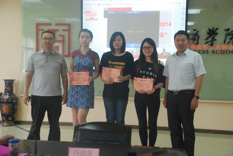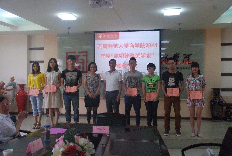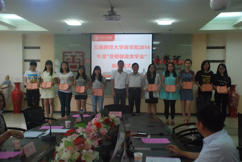 5月16日下午,商學院“昆明律政獎學金”2014年度頒獎典禮在慧宇樓102會議室隆重舉行。昆明律政培訓學校杜彥能校長,云南師范大學商學院王昆來校長、杜國海副院長,法學院馮治良院長、王雪副院長、譚艷書記等老師及法學院31名獲獎學生參加了頒獎儀式。法學院院長馮治良教授主持了儀式。儀式上,王昆來校長首先宣讀授獎決定。接著,律政學校杜彥能校長發言,他說從2012年11月份起,昆明律政培訓學校與云南師范大學商學院法學院簽訂了合作協議,針對法學院英語過四六級的學生設立“昆明律政獎學金”,此項獎學金已發放兩年,惠及70多名學生,充分表明了律政學校和法學院對同學們的關心和支持。同時他希望同學們能更加努力學習,全面發展,將來為學校、社會發展做出貢獻。云南師范大學商學院杜副校長也發表講話。他指出,此項獎學金的設立和發放充分體現了法學院“以學生為中心”的理念,為學校培養具有國際視野的高素質法律人才注入了全新動力,也體現了律政學校為學生服務、為社會服務,積極承擔社會責任的辦學理念。促進了法學院多元激勵機制的形成,也讓法學院廣大學生在學校溫馨的幫助和關照下能更快更好的成長成才。接著,法學院獲獎學生代表發表感言,對兩校領導、老師們表示感謝,認為學院多元激勵機制的建立不僅給同學們帶來了生活上的幫助,還從精神上給予了巨大的激勵。在談了自己的學習經歷和體會后,他表示會和廣大同學一樣更加努力學習,在人生道路上積極進取。隨后,法學院王雪副院長發表講話,她說目前全國法學專業學生多達60多萬,社會對法學人才需求較大,但普遍存在學生就業難、企業招工難的問題,而法學院一直致力于解決這一難題,對學生培養不僅注重專業素質培養,更加注重結合社會需求來提升學生實踐能力。學院設立多項獎學金建立全面完整的獎勵制度為學生提供多方面的支持,希望廣大學生珍惜學習機會,努力全面提升各方面實力,成為社會需要的卓越法律人才。 最后,律政學校杜校長、云南師范大學商學院王校長、杜副校長等領導為31名獲獎學生頒發了獎狀、獎金,所有參加儀式的師生在文淵樓前合影留念后,頒獎式在歡聲笑語中圓滿結束。