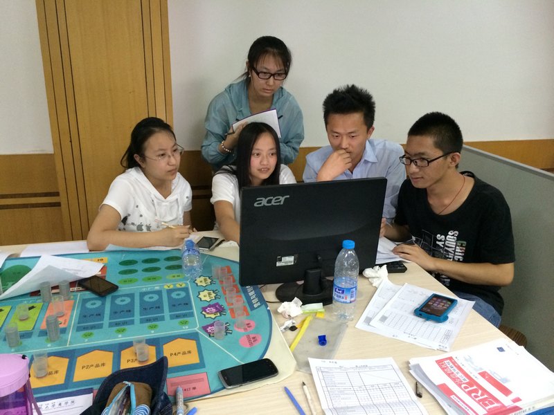 5月18日下午,云南師范大學(xué)商學(xué)院第八屆ERP沙盤模擬大賽決賽在海源校區(qū)沙盤模擬實驗室拉開帷幕,本次參賽的6支隊伍30名同學(xué)均來自工商管理學(xué)院11級工商管理專業(yè),他們是從5月15日的初賽的12只隊伍經(jīng)過激烈角逐進入復(fù)賽的。比賽以ERP系統(tǒng)操作和手工沙盤相結(jié)合,在比賽之前,指導(dǎo)老師孫琳琳強調(diào)了ERP沙盤模擬對學(xué)生的重要意義,鼓勵同學(xué)們積極參加。比賽中,各參賽隊伍首先聆聽裁判老師關(guān)于本次比賽規(guī)則,接著開始對自己的“公司”進行六年的經(jīng)營,各參賽隊伍在CEO的領(lǐng)導(dǎo)下,隊員們開始埋頭苦算,有的熱烈討論,有的在低頭沉思,大家各司其職又服從統(tǒng)一,體現(xiàn)了良好的團隊意識。而每當(dāng)每年財務(wù)報表出來后,比賽現(xiàn)場更是幾家歡喜幾家愁,排名靠前的隊伍面對市場與競爭對手更有信心走下去,排名靠后的則開始耐心分析自己于其他團隊的差距在哪里,總結(jié)失誤,調(diào)整自己的方案。本次比賽不僅體現(xiàn)了云南師范大學(xué)商學(xué)院學(xué)生良好的團隊協(xié)作能力,提高了同學(xué)們對公司經(jīng)營管理與市場的認識,而且為同學(xué)們提供了一個將理論與實踐相結(jié)合的鍛煉平臺。最后,經(jīng)過緊張的比拼,兩支隊伍突出重圍取得良好的并將代表學(xué)校參加5月23日云南省大學(xué)生ERP沙盤模擬大賽。