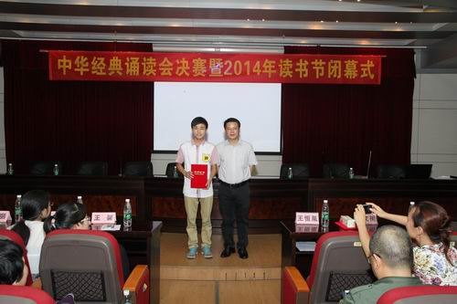 閉幕式在中華經典誦讀會決賽的比賽中拉開序幕,進入決賽的10名同學經過最后的角逐,最終由賈東杰同學憑借《放歌》獲得一等獎,默學森、梁幸煒同學分獲二等獎,王新文、張騰飛、蘇淡彬同學獲三等獎,而譚憶娜、陳一丹、麥偉玲、余丙聰同學獲優秀獎。伴隨著2014年讀書節最后一個活動——中華經典誦讀會決賽的結束,圖書館館長李錦蘭做讀書節活動總結發言,回顧本次讀書節活動的十個專題活動。童漢清書記宣讀了表彰決定,對在讀書節活動中表現突出的讀者進行表彰。最后,由王恒胤副書記,圖書館、學生處、團委、宣傳部等領導老師為本次讀書節活動的優秀讀者、電子資源利用大賽及中華經典誦讀會的獲獎同學頒獎。2014年讀書節活動圓滿結束。