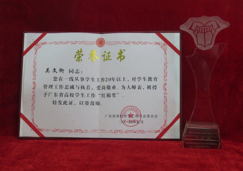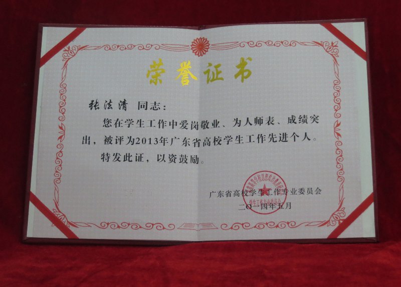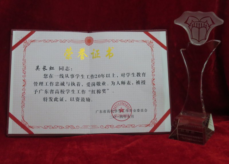 大會對獲得2013年廣東省高校學生工作“紅棉獎”、“先進個人”、“優秀團隊”及學生事務管理“精品項目”進行了表彰。廣東石油化工學院宣傳部部長(原學生處處長)黎齊英、學生處處長(原團委書記)吳文銜、團委副書記吳長虹三人被授予“紅棉獎”,學生處被評為2013年“廣東省高校學生工作優秀團隊”, 計算機與電子信息學院輔導員張法清被評為2013年“廣東省高校學生工作先進個人”。