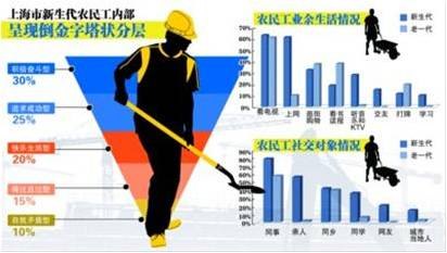 從全國看,這一群體結(jié)構(gòu)為“圓柱形”,即各類型各占約20%比例;而在上海,這一群體結(jié)構(gòu)呈現(xiàn)“倒三角形”,即積極奮斗型人數(shù)最多,“正能量”占比大,結(jié)構(gòu)也更“健康”。比如他們?cè)敢鈪⒓芋w鍛、結(jié)伴旅游等社交活動(dòng),也愿意在網(wǎng)絡(luò)上查找信息并發(fā)表個(gè)人見解,這都反映新生代農(nóng)民工正逐步打破“同血緣、同鄉(xiāng)緣、同業(yè)緣”的圈子限制,逐步融入城市。
