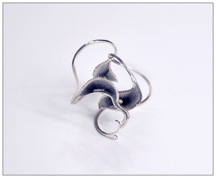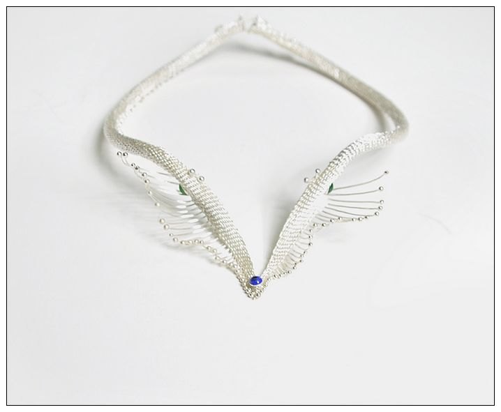 《沉》、《Deep Breath》、《虍幾》、《見》等四個系列的作品則打破了傳統的首飾設計理念,將傳統手工藝的代表--刺繡與金屬飾品相結合,在材料上大膽創新,追求手工藝語言的當代性表達。指導老師鄭靜給出了“工藝性、學術性很不錯”、“具有一定的學術價值”的高度評價。創新的背后總是要付出更多的汗水,在刺繡和首飾設計相結合的過程中,刺繡的大小是需要精準的計算,刺繡的花紋,針的走向一定要和首飾的設計交相呼應,實現視覺上的統一。這些苛刻的要求需要經過一次又一次的實驗才能最終敲定設計方案。《虍幾》不但在材料上有了突破,還在造型方面繼續創新,它打破了之前作品的二維視覺效果,將立體造型運用到設計中,創造了三維的視覺層次感。