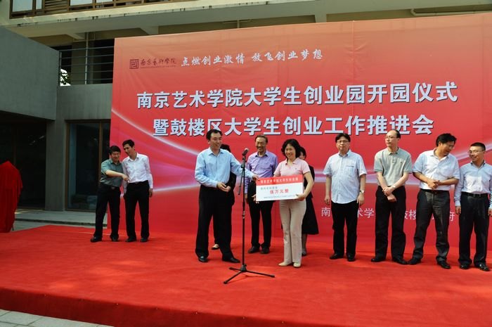 開園儀式上,南京市人社局副局長江萍為南藝頒發了“就業創業指導站建設基金”十萬元,鼓樓區委常委、副區長周文中為南藝頒發了“大學生創業園建園獎勵資金”五萬元。