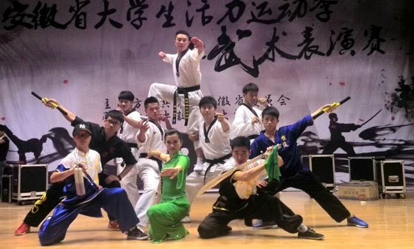 《中國(guó)夢(mèng)—夢(mèng)之武》以夢(mèng)境為劇情背景,展現(xiàn)了雙截棍、刀、劍和跆拳道等武術(shù)項(xiàng)目的獨(dú)特魅力。表演中,隊(duì)員們擺出“迎客松”及“品”字等舞臺(tái)造型,贏得在場(chǎng)觀眾的熱烈掌聲。代表隊(duì)由來(lái)自體育、生環(huán)、外語(yǔ)、文學(xué)、化工、信工、機(jī)電等7個(gè)學(xué)院的10名同學(xué)組成,體育學(xué)院張星杰老師擔(dān)任指導(dǎo)老師并對(duì)整場(chǎng)表演進(jìn)行策劃構(gòu)思。賽前訓(xùn)練中,團(tuán)隊(duì)發(fā)揚(yáng)不怕苦、不怕累、爭(zhēng)上游的精神,在為期一周的時(shí)間里,利用中午和晚上課休時(shí)間刻苦訓(xùn)練。