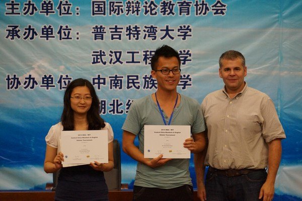 本網(wǎng)訊(通訊員李攀 李翔) 5月23日—25日,“第六屆IDEA中國辯論教育聯(lián)絡(luò)組——華中地區(qū)中英文辯論賽”在武漢工程大學流芳校區(qū)4號教學樓舉行。此次大賽由國際辯論教育協(xié)會主辦、美國普吉特灣大學與武漢工程大學承辦、中南民族大學和湖北經(jīng)濟學院協(xié)辦。武漢工程大學副校長張彥鐸,教務(wù)處處長韓高軍,國際學院院長、處事處處長李瓊,外語學院院長彭石玉,美國普吉特大學CDEN華中地區(qū)美方聯(lián)絡(luò)人Derek Buescher教授和他的5位學生受邀出席了大賽。副校長張彥鐸為比賽致開幕詞和閉幕詞,Derek Buescher 教授對賽事進行了點評。