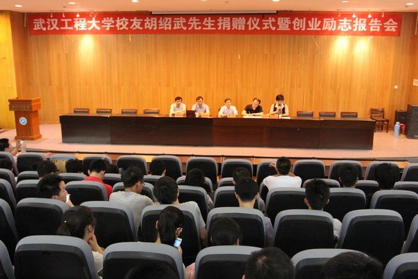 本網(wǎng)訊(通訊員畢靈敏)5月26下午,武漢工程大學(xué)1993屆杰出校友胡紹武先生回校捐贈(zèng)并為在校學(xué)生舉行創(chuàng)業(yè)勵(lì)志報(bào)告會(huì)。活動(dòng)在流芳校區(qū)圖書(shū)館報(bào)告廳進(jìn)行。出席會(huì)議的有副校級(jí)干部吳鋒教授、計(jì)算機(jī)學(xué)院黨委書(shū)記魯曉君等,大會(huì)由校友會(huì)、基金會(huì)副秘書(shū)長(zhǎng)沈國(guó)紅主持。參加會(huì)議的有計(jì)算機(jī)學(xué)院、化工與制藥學(xué)院的在校師生200余人。