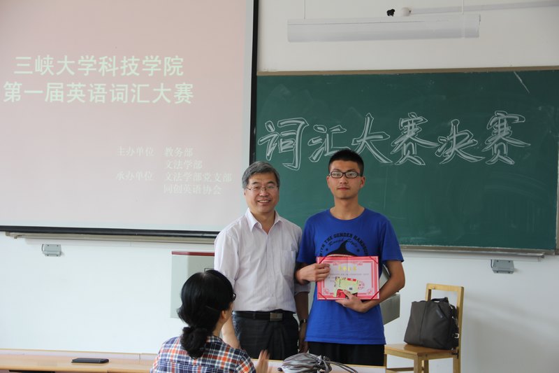 5月22日下午,由教務部和文法學部主辦,文法學部黨支部和同創英語協會承辦的三峽大學科技學院首屆英語詞匯大賽圓滿落幕。學院副院長高學軍、文法學部主任劉建新、教務部副主任姜華作為嘉賓為本次大賽獲獎選手頒發證書及獎品。