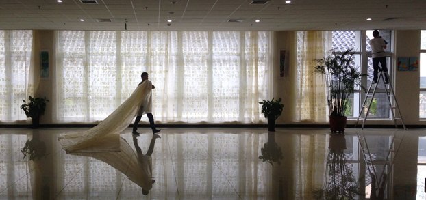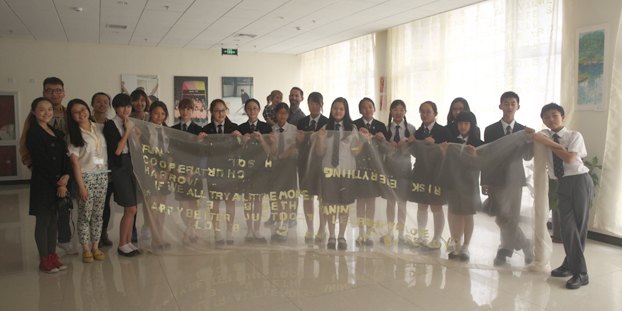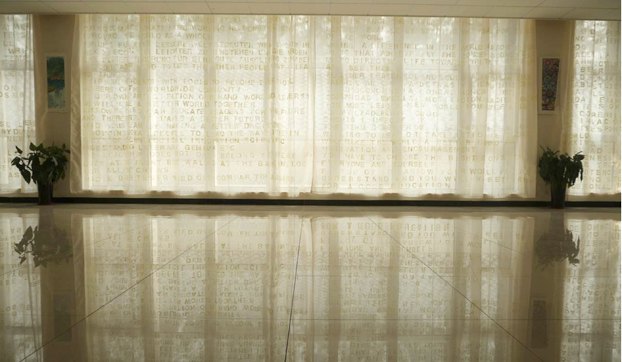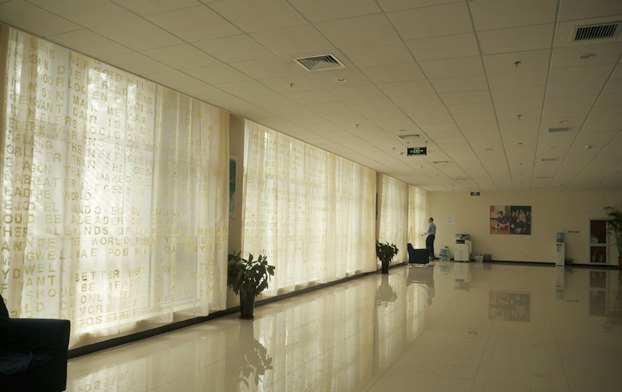 我對材料的選擇實驗了很久,最終選擇2060冰紗,這種材質不易皺,不易臟,而且親切、透明,更有意思的是它單純得沒有任何紋理的材質,但是當我把兩層冰紗疊加在一起,在陽光下便產生了光暈感和飄忽不定的感覺。文字的呈現,我選擇用印章將字母一個一個印刻上去,因為印章在中國古代代表的是權威、力量。這種肯定的方式以冰紗這種捉摸不定的材質為載體,體現學生們可變和多樣的特性。而把全校師生對校訓的理解放在一起,意在讓他們反思人與人,人與歷史的關系。