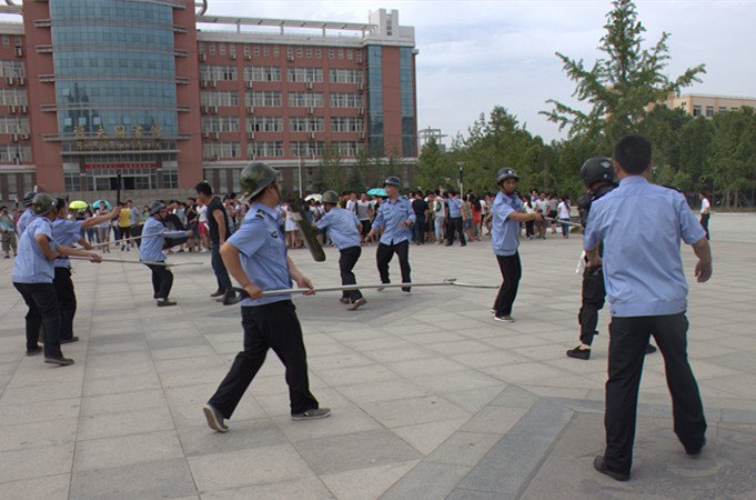 演練開始后,一輛不明身份的車輛要進入校園,校園保衛人員上前盤查,車上暴徒沖破門崗強行闖入校園,現場安保人員迅速報警,保衛處迅速啟動處突應急預案,一邊向校園110指揮中心和東城區公安分局110報警,一邊迅速調集全體安保人員手持防暴器械趕到現場增援。在事發現場,部分人員沿途掩護四下撤離的師生,其余的安保人員利用防爆恐裝備對不法分子進行圍堵,對不法分子形成合圍隔離之勢,使師生免遭傷害。東城區特警迅速趕到現場,成功將暴恐分子制服并帶離校園。此次演練收到了預期效果。一是鍛煉了學校安保人員如何控制暴恐現場,與歹徒對持,將歹徒與師生隔離,減少傷害,為公安力量制服歹徒贏得時間。二是增強了學校安保人員防恐處突能力,在類似事件中有效封控犯罪分子,及時疏導師生迅速撤離現場,自保自救,減少傷害。三是增強了校園110、東城區公安分局、許昌市公安局110指揮中心接報警后的對接處置能力。