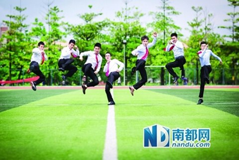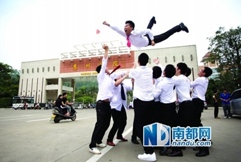 跑道上,5個著正裝的男生被一群禮裙飄飄的女生圍住。女生笑著跑向那5個略顯“羞澀”的男生。現場正上演“搶新郎”的好戲。這是惠州學院旅游系10級旅管2班的同學在拍畢業照,定格他們在大學度過的最后一年。