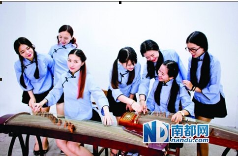 惠州學院音樂室里,7個清純靚麗的女生,身穿淺藍色上衣、黑色裙子民國學生裝,彈奏起古箏來文藝范十足,“我們想把畢業照拍得更有內涵和韻味。”大四音樂表演班的小雅說。她們有的坐在古箏旁彈奏古曲,有的在旁邊聆聽欣賞,歡聲笑語盡顯同窗友誼。