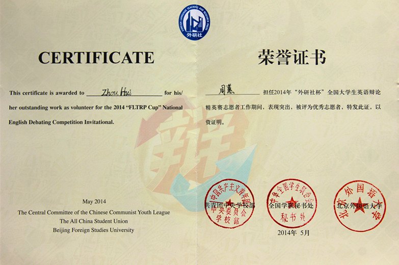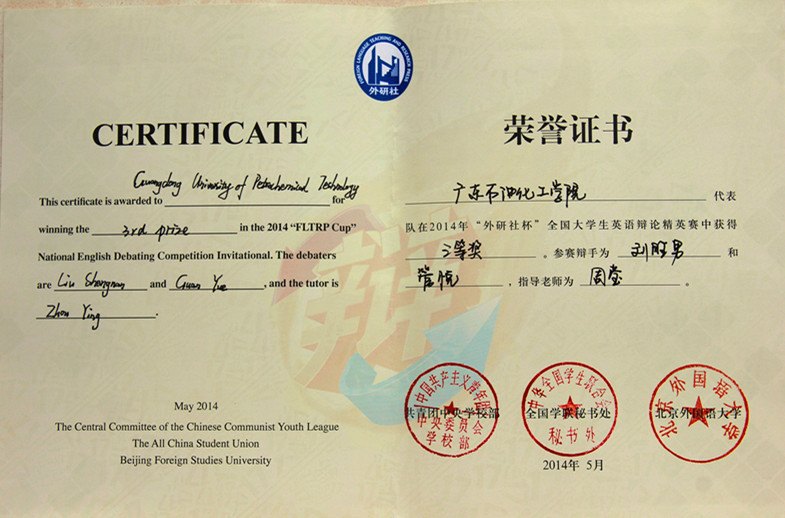 5月18日至23日,由團中央學校部、全國學聯、北京外國語大學主辦,外語教學與研究出版社、中國教育電視臺聯合承辦的2014年“外研社杯”全國大學生英語辯論精英邀請賽在北京隆重舉行。廣東石油化工學院劉勝男和管悅等2名同學和指導老師周瑩組成的GDUPT代表隊,歷經為期6天12輪的循環賽和淘汰賽,榮獲全國三等獎。同時。周秀敏、周蕙榮獲“優秀志愿者”稱號。