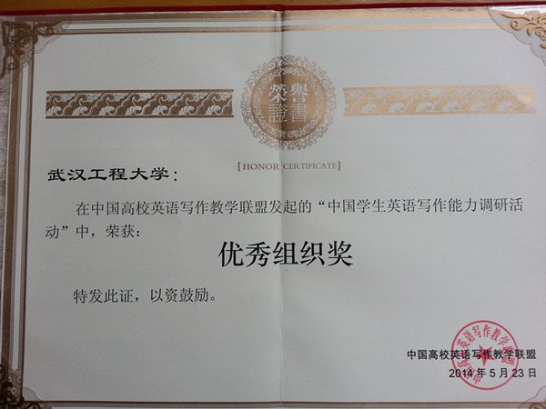 武漢工程大學在“中國學生英語寫作能力調研活動”中榮獲優秀組織獎