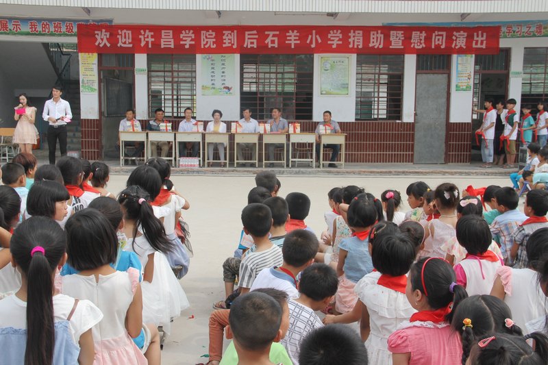 5月30日,六一兒童節到來之際,許昌學院紀委書記羅鳳英帶領關工委、對口扶貧工作組等相關部門領導和許昌學院慰問演出小分隊的同學們一行40余人,來到許昌學院對口幫扶單位——周口市西華縣黃橋鄉后石羊村小學,進行圖書、學習文具等捐贈活動和慰問演出,為小朋友帶來了節日的祝福。